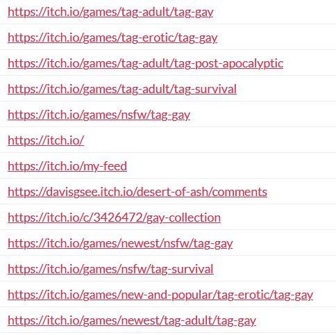I released His Own Being the same month that itch.io delisted all adult content. When that happened, the game's visibility was shot, as it became impossible to find through tags and searches. If adult content hadn't been delisted for paid projects, its analytics might look something like this: